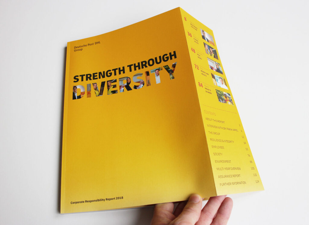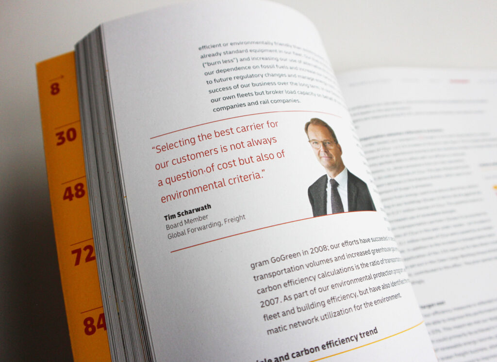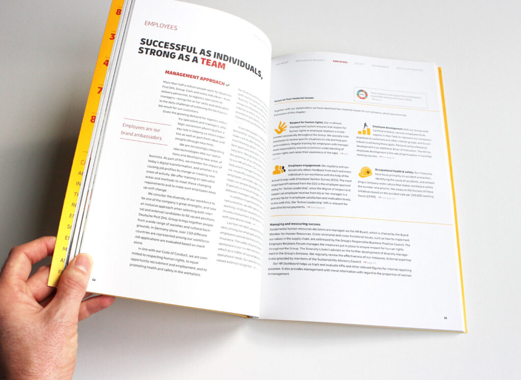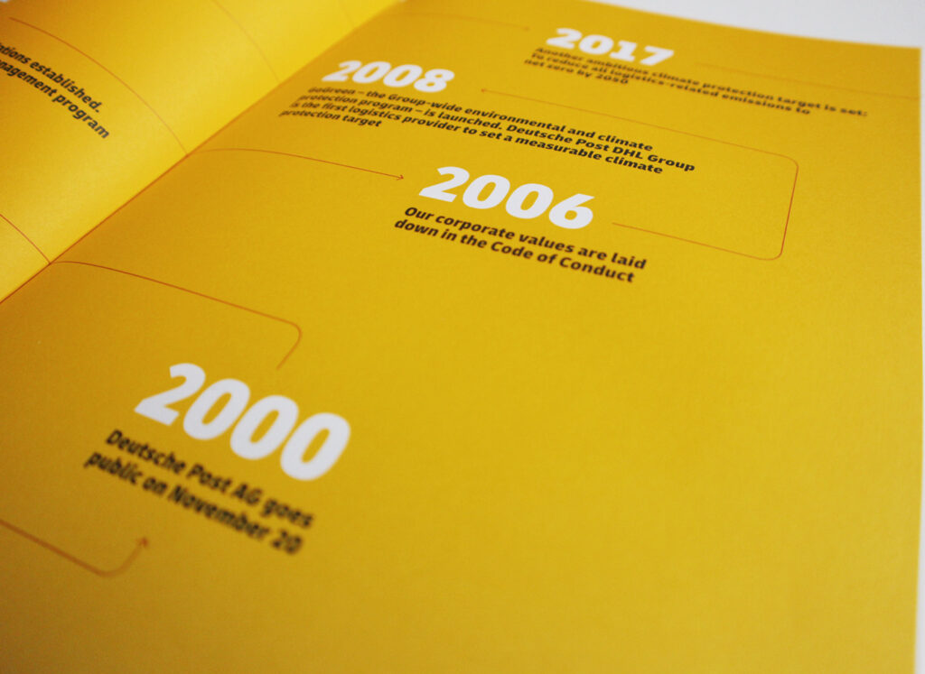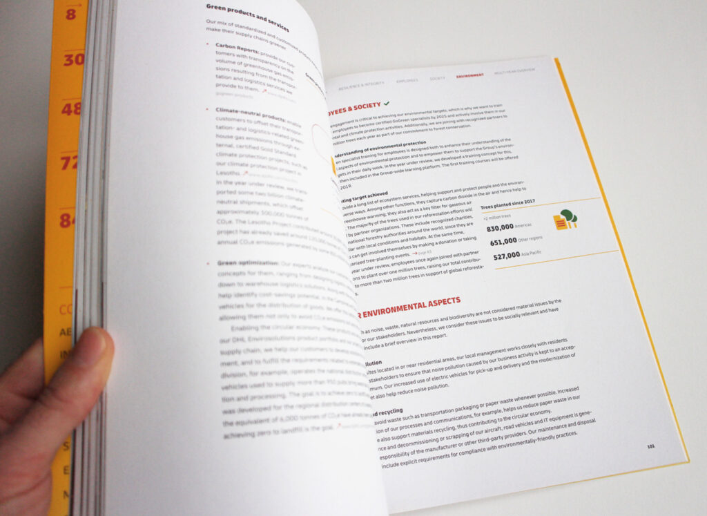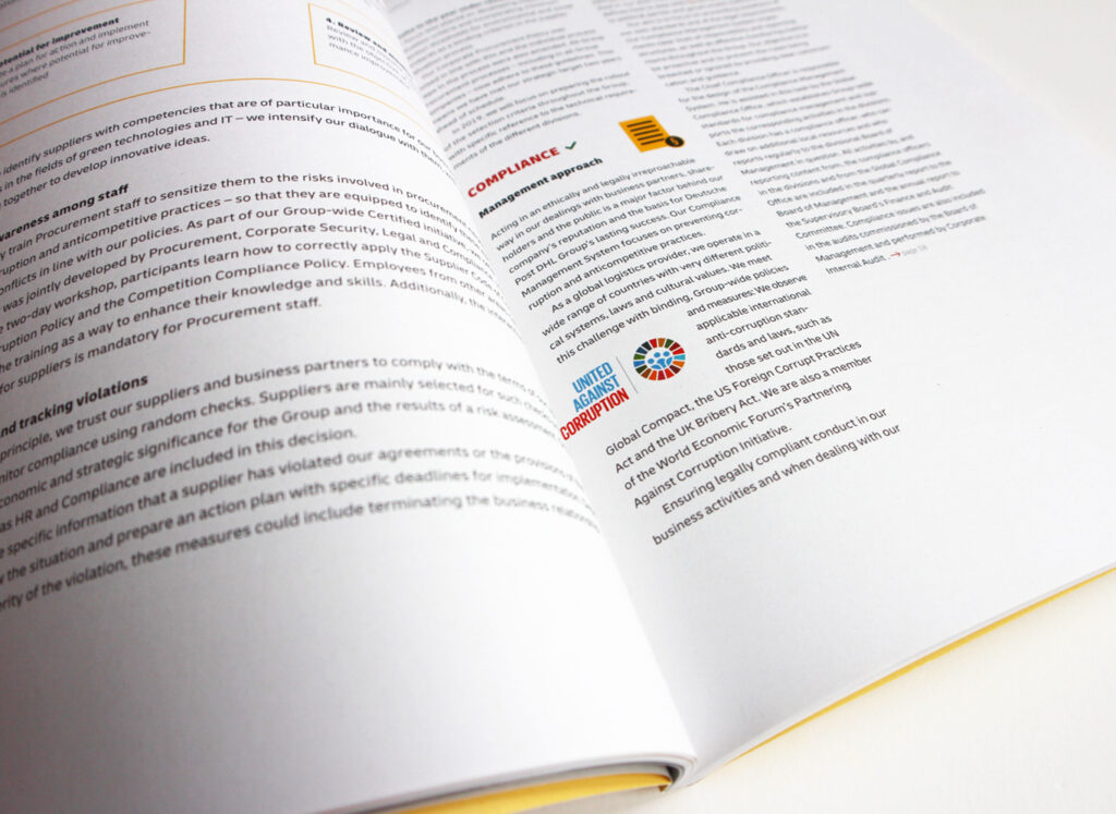 Vom Entwurf bis zum Launch betreute ich den Nachhaltigkeitsbericht der Deutschen Post DHL Group in einer englischen und deutschen Version für die Agentur Honiggelb in Düsseldorf als Freelancer zusammen mit Sandra Maurischat. Zur PDF Version ↗